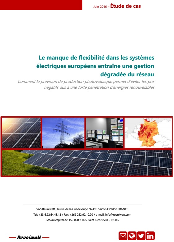 Le marché allemand a été touché le 8 Mai 2016 par une pénétration exceptionnelle d’énergies renouvelables variables (solaire et éolienne) à hauteur de 87% de la production électrique du pays, ce qui a provoqué l’occurrence de prix négatifs d’environ -144.78 € en moyenne sur le marché spot tout au long de la journée. Cet événement a été engendré en grande partie par la qualité variable des énergies renouvelables qui pousse les gestionnaires à subir l’oscillation de ces ressources. Grâce à la prévision de production d’énergie photovoltaïque, une innovation complètement maîtrisée par Reuniwatt, le solaire devient une énergie garantie. Cette technologie permet ainsi une gestion réelle de l’énergie, avec la disparition progressive des phénomènes de prix négatifs.